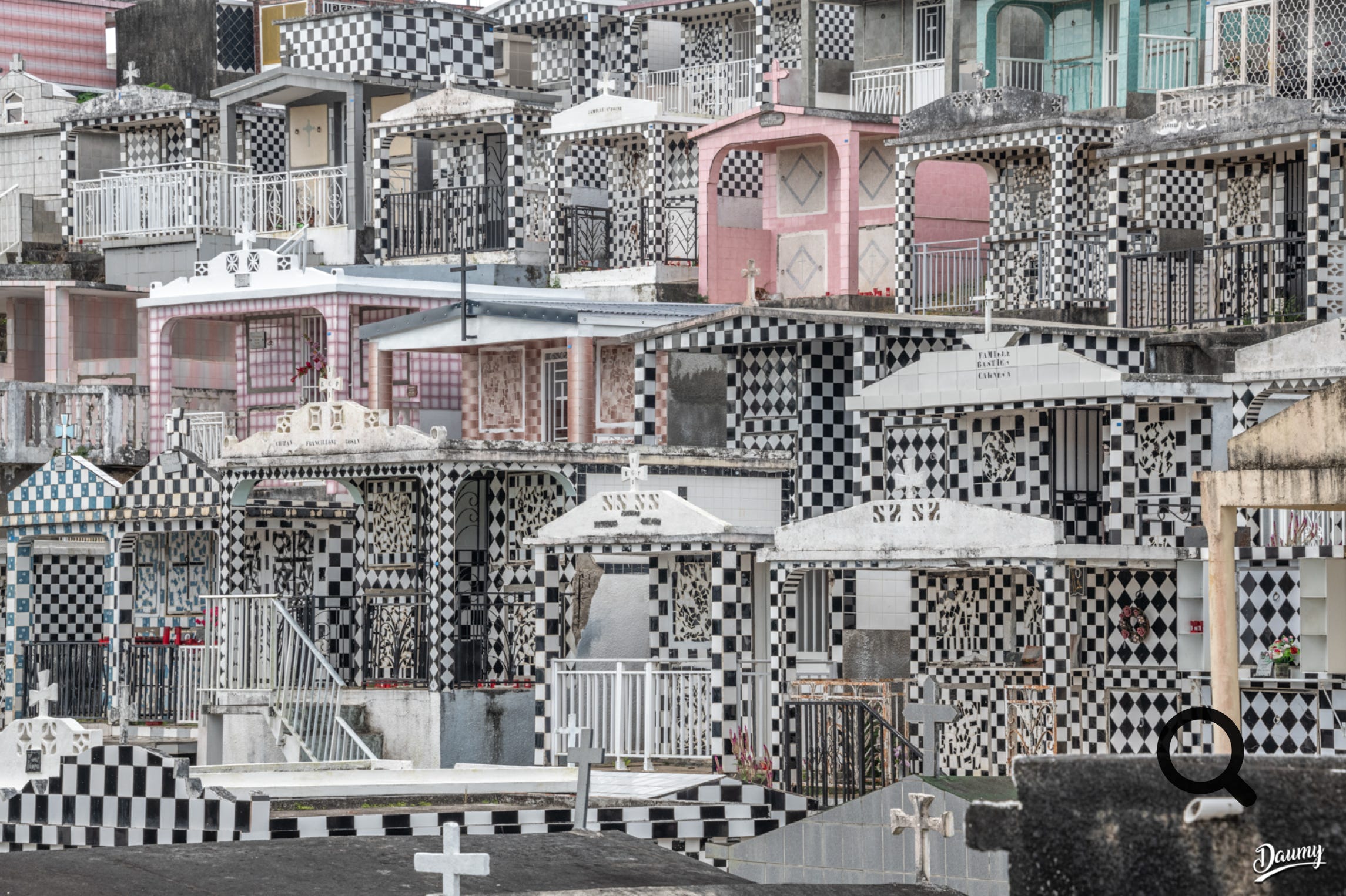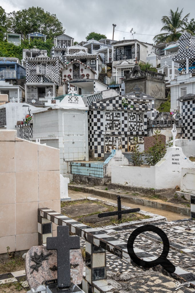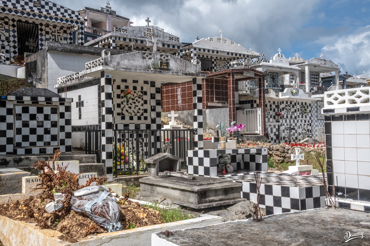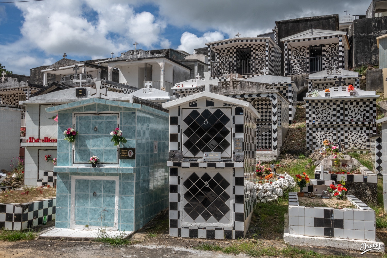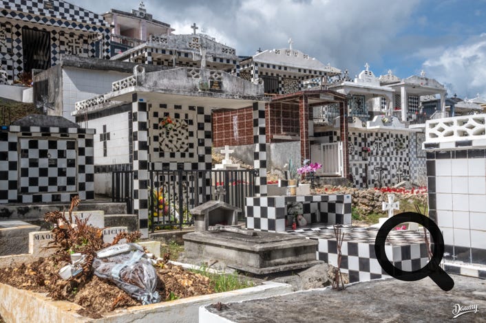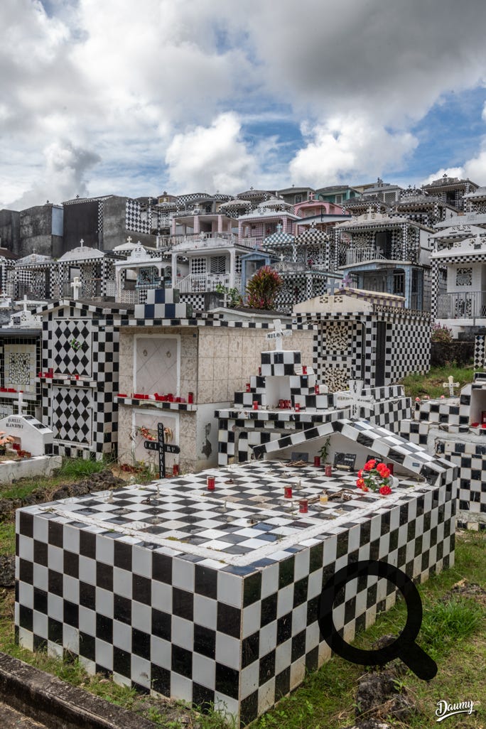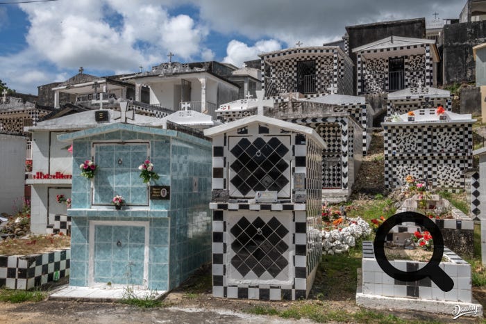 Cimetière à flanc de colline avec des tombes en carrelage de faïence et en damier noir et blanc, certaines comme des maisons.