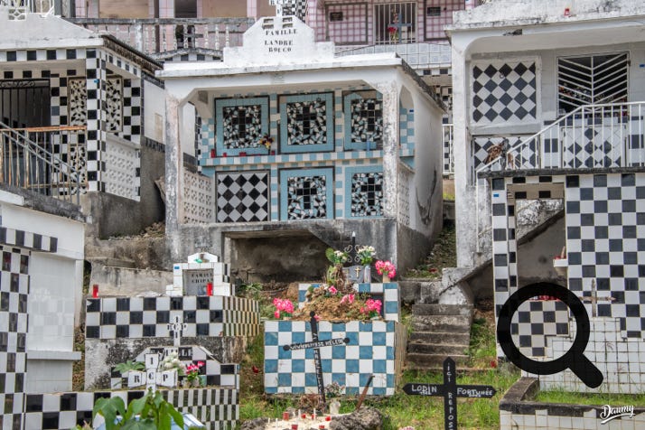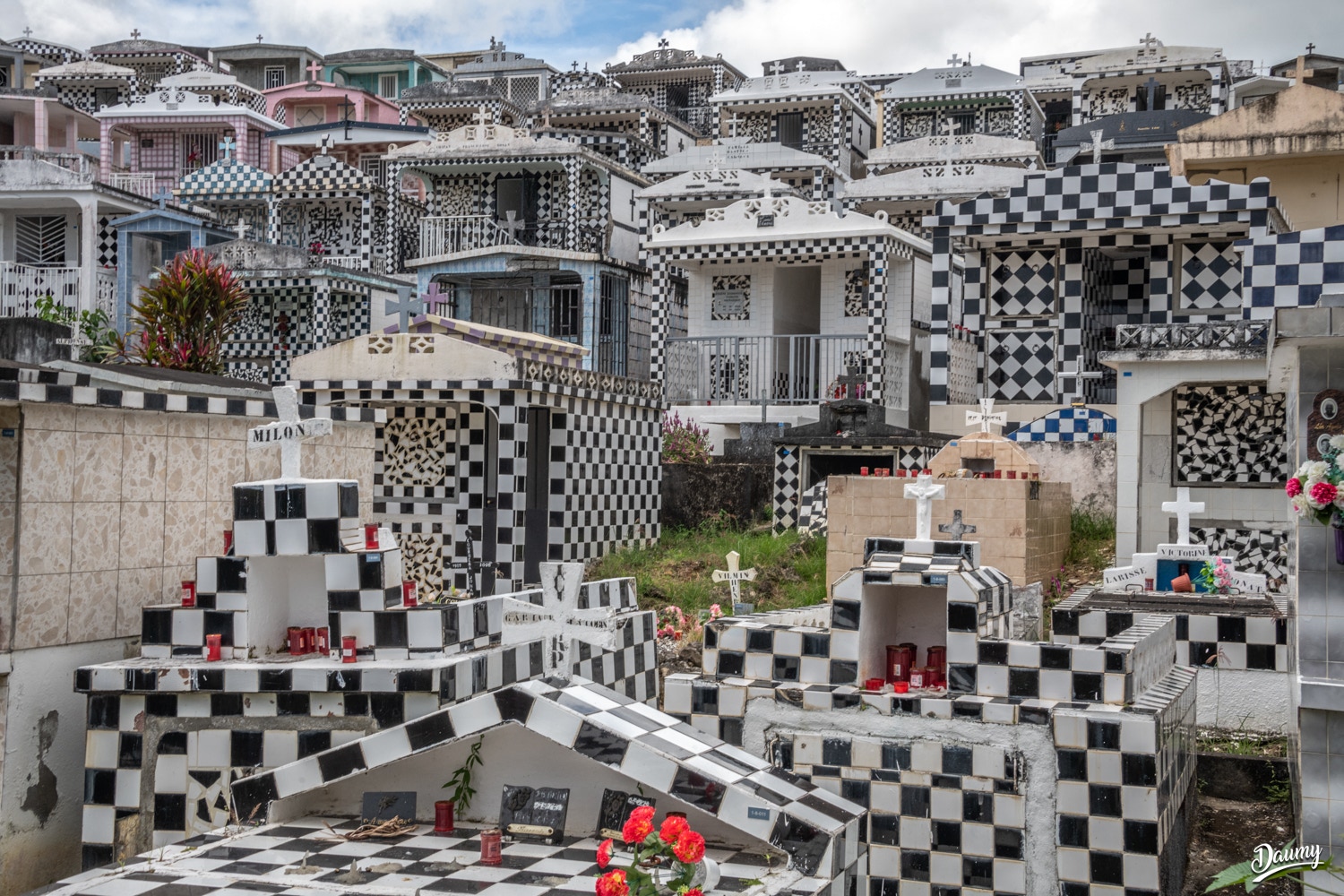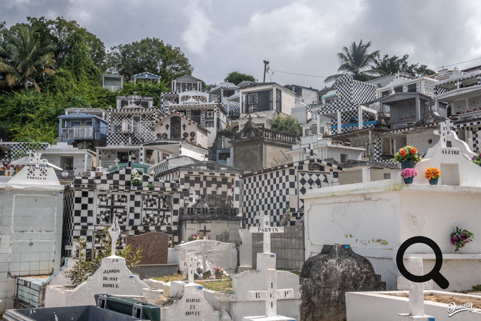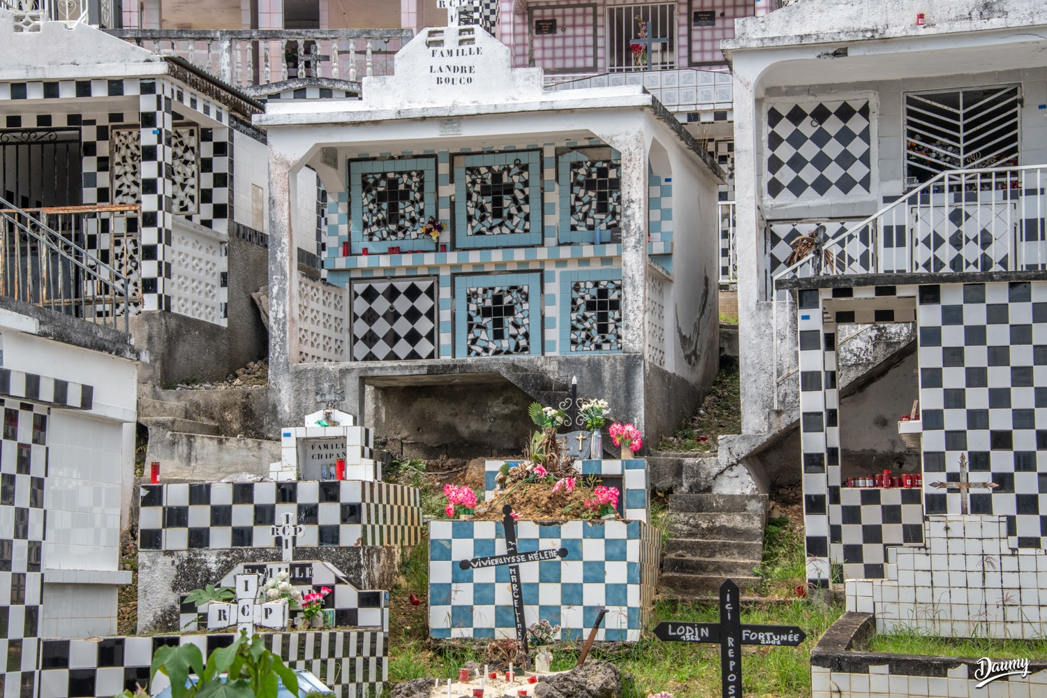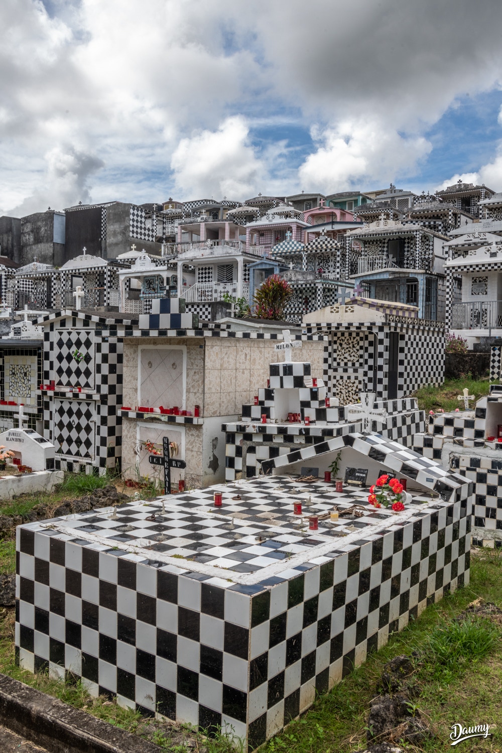 Cimetière à flanc de colline avec des tombes en carrelage de faïence et en damier noir et blanc, certaines comme des maisons.