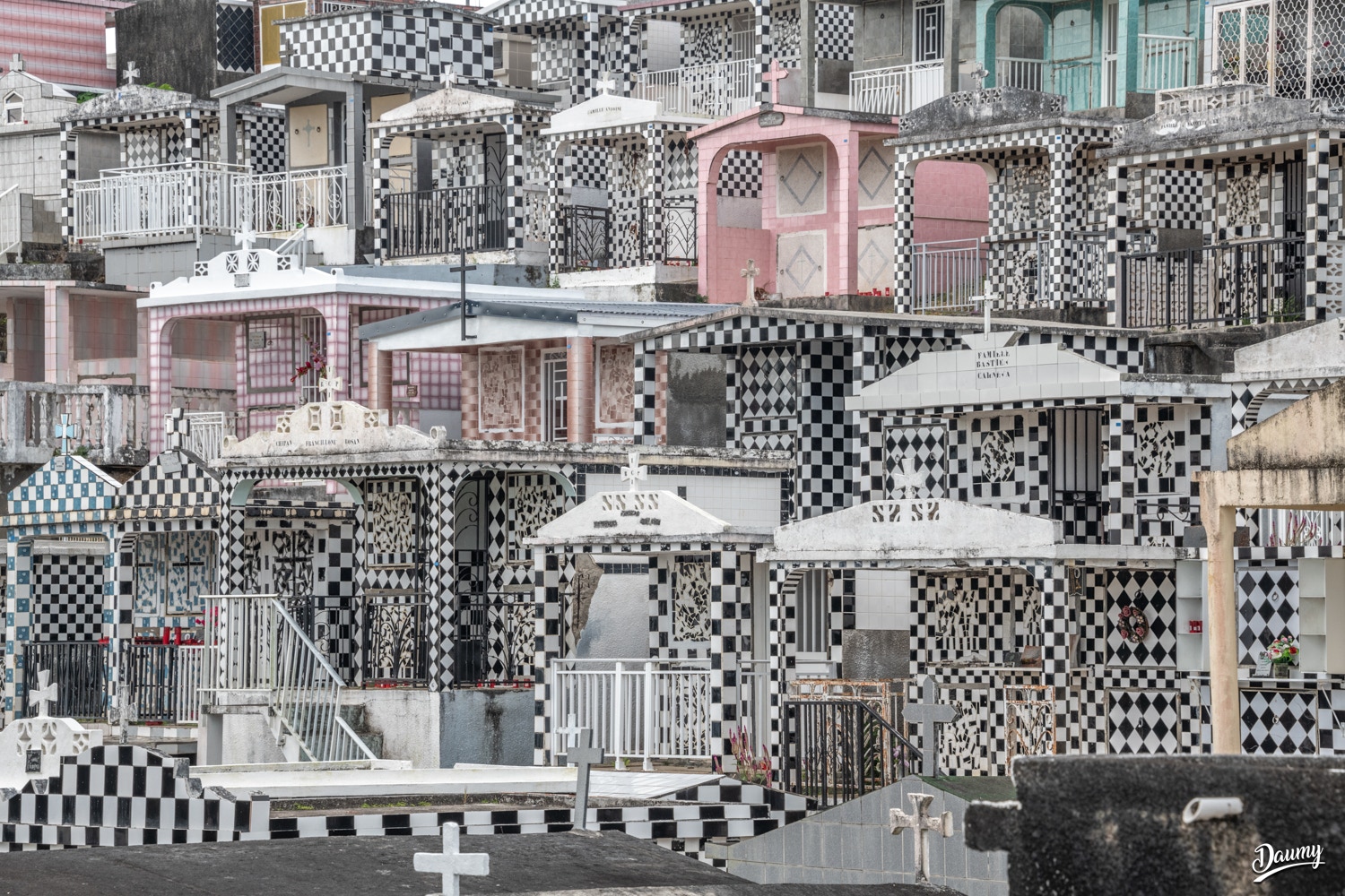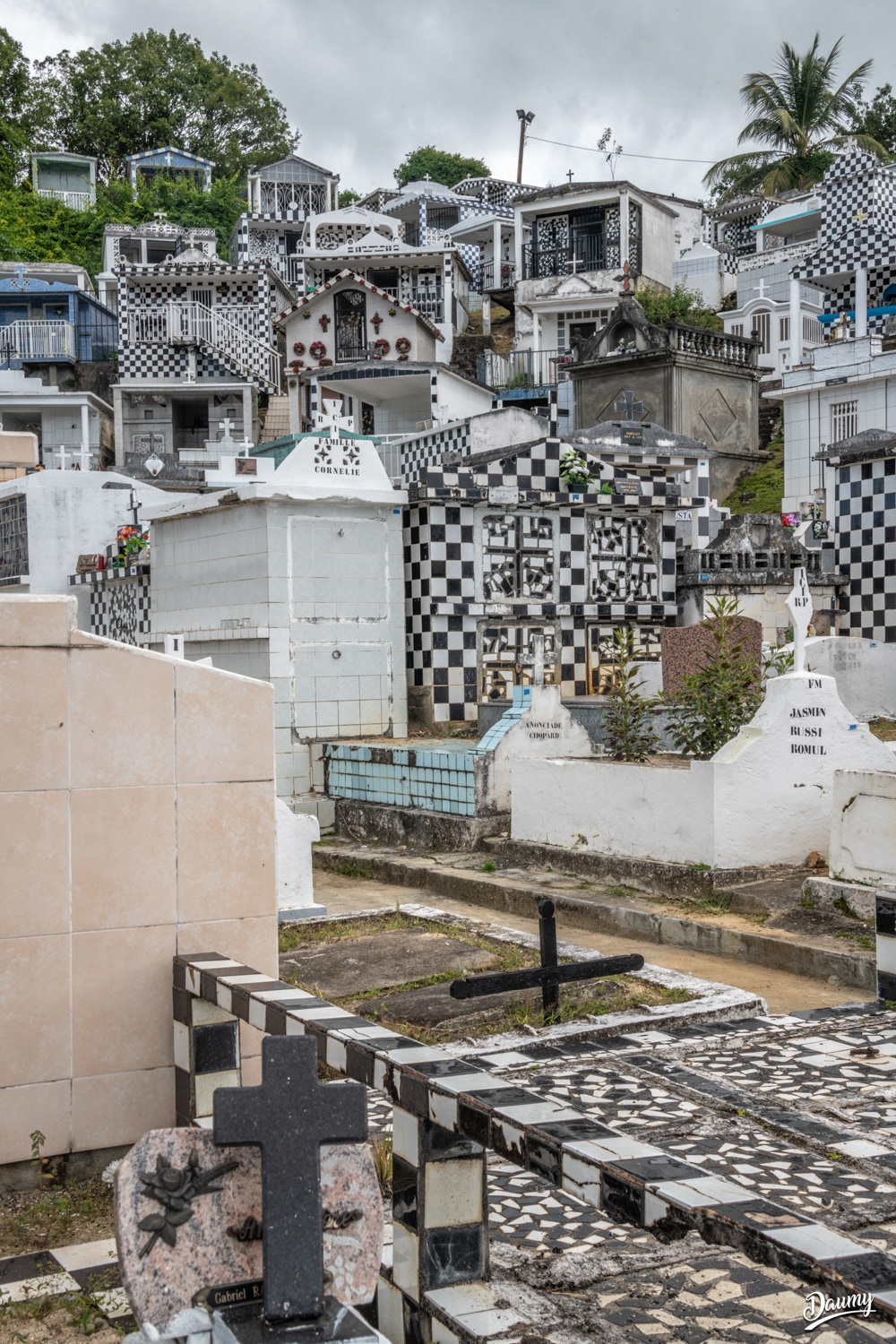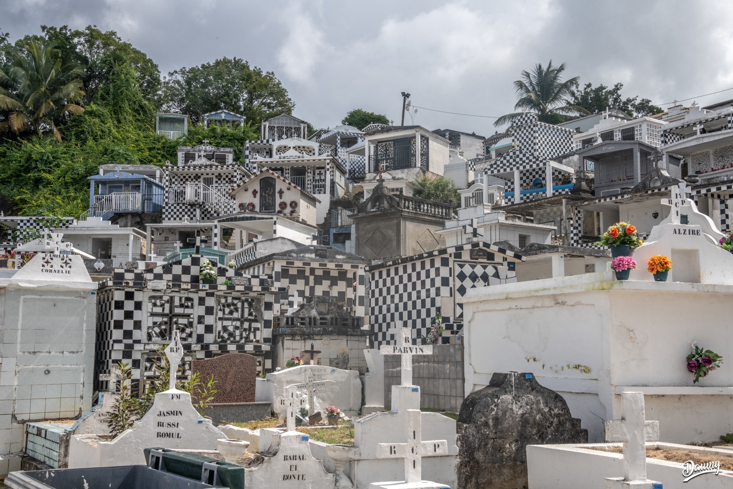 Cimetière à flanc de colline avec des tombes en carrelage de faïence et en damier noir et blanc, certaines comme des maisons.